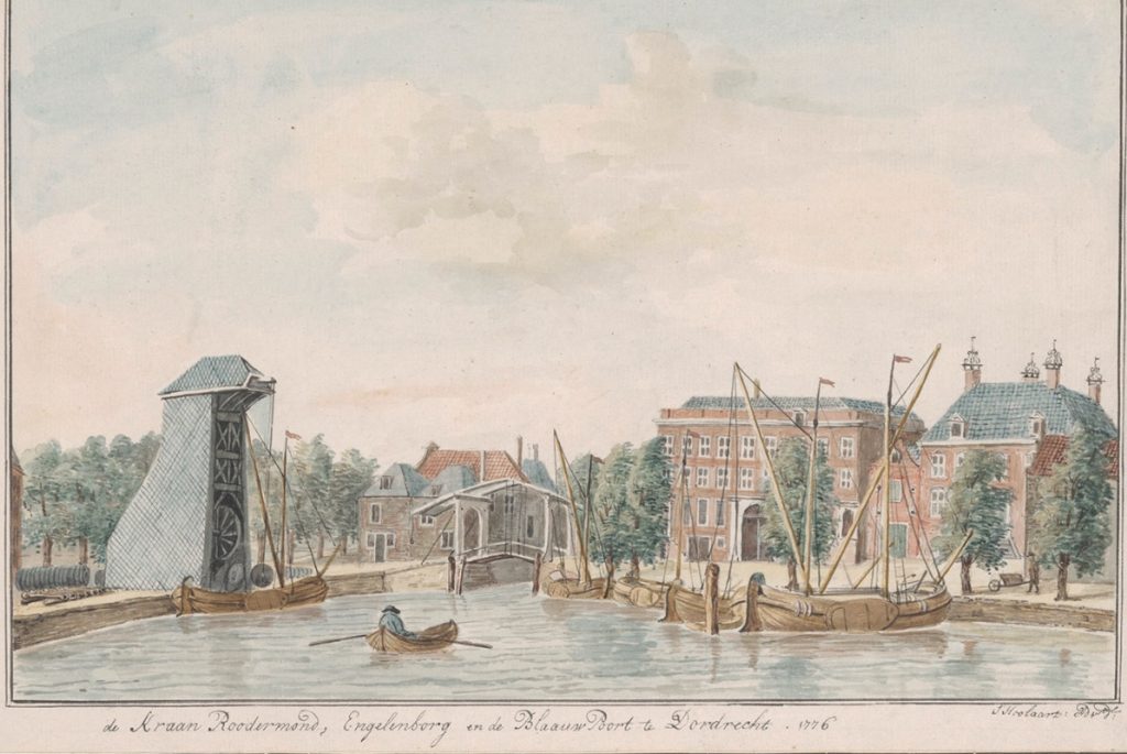 De Blauwpoort (rechts) met de Engelenburgerbrug en links de kraan Rodermond. Tekening van J. Hoolaart uit 1776. (foto: RA Dordrecht)