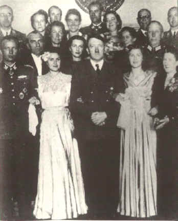 (Boven uiterst links Reichsfuehrer-SS Heinrich Himmler, die met Martin Bormann getuige was.) Hitler nam niet deel aan het bruilofsfeest in Bormanns villa.