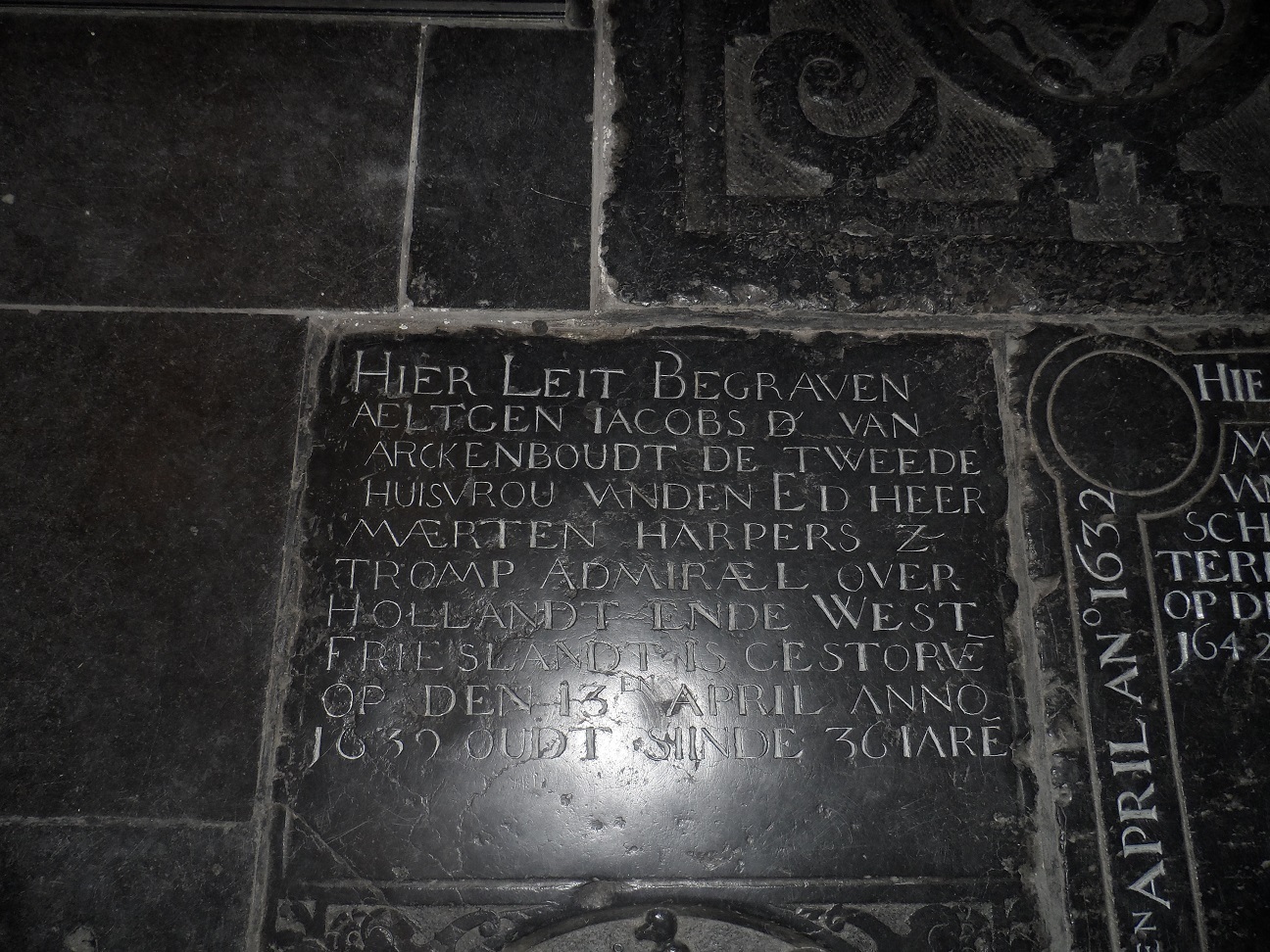 Grafzerk van Aeltgen Jacobsdr. van Arckenboudt in de Laurenskerk te Rotterdam. Zij trouwde 12 sept. 1634 Maarten Harpertsz. Tromp