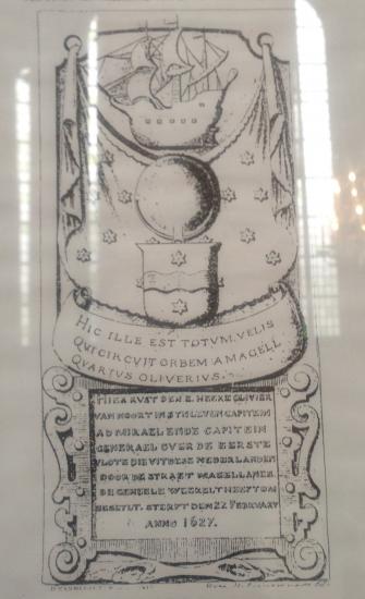 Grafzerk van Olivier van Noort in de Grote of Bartholomeuskerk te Schoonhoven. “Hier rust den E. Heere Olivier van Noort, in syn leven capiteyn generael van de eerste vlote, die uit dese Nederlanden door de straet Magellanes de geheele weerelt heeft om geseylt; sterft den 22 February anno 1627”.