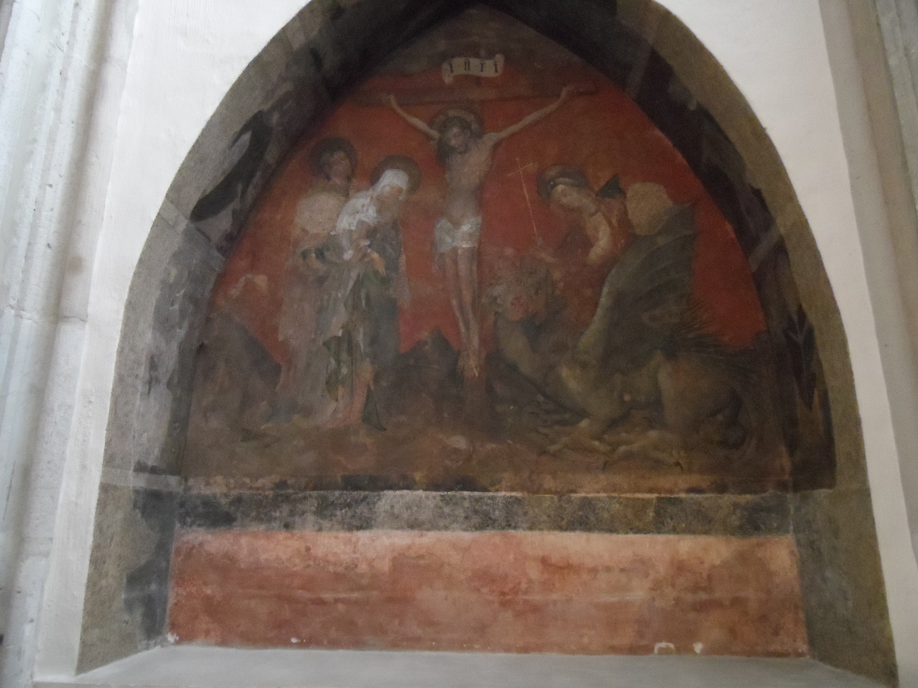 De schildering kwam in 1919 tevoorschijn na de verwijdering van een uit kloostermoppen gemetselde omuur) die haar eeuwenlang beschermd had, zodat zij op twee vierkante gaten van 10 cm zijde na, vrijwel gaaf gebleven is. Blijkens de twee toen gevonden draaipunten in het linkerprofiel van de boog en een afgewerkte aanslag in het overeenkomstig profiel aan de rechterkant was er oorspronkelijk een draaibaar luik voor de schildering bevestigd, zoals er ook nu weer een aanwezig is. De hoogte van de boognis is 1,60 m, de breedte 1,65 m. Onder de nis stond eens een altaar, gewijd aan Sint Margriet, dat het eerst in 1438 vermeld wordt. Op de schildering ziet men in het midden Christus aan het kruis, links Maria, die, ineenzijgend, door Johannes ondersteund wordt, rechts de H. Margaretha met haar attribuut, de draak. De achtergrond is dofrood, de Calvarieberg bruin, het gewaad van Maria, die een witte hoofddoek draagt, blauw met een vaalgroene voering, de mantel van Johannes violet, terwijl Margaretha gehuld is in een roomwitte tunica en een donkere mantel, het monster is vaalgroen van kleur. Uit het hele tafereel en de sterk expressieve gezichten en handen spreekt, ondanks de ingetogen gebaren en houdingen, een fel dramatische aandoening. Ook de dagkanten van de boog zijn beschilderd: men onderscheidt nog vaag de kazuifels en mijters van twee bisschoppen en men ziet St. Barbara, herkenbaar aan de toren, die zij in haar hand draagt. De voorstelling van de Kruisiging is aangebracht op een bruinachtige grondkleur, waaronder op beschadigde plekken geel en rose tevoorschijn komen en waarop men sporen van overschilderingen ziet, bij de Christusfiguur de brede omtrek van een andere figuur, links van Margriet resten van een ander, meer naar links gebogen hoofd.