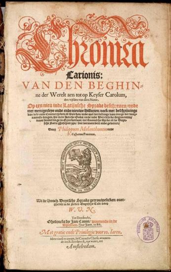 (Canin kreeg in 1586 van de Staten-Generaal en de Staten van Holland tien jaar lang het alleenrecht om de “Chronica Carionis” te mogen drukken en verkopen.)