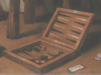 Tiktakbord (ook: triktrakbord), detail van een schilderij van Jan Steen.
