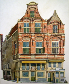 4. voor 800 gl. aan Willem van der Lee een huis in de Kromme Elleboog aan de brug, bestaande uit drie achter elkaar staande woningen, met een huisje daarnaast, staande tussen de gracht en het huis van de verkopers